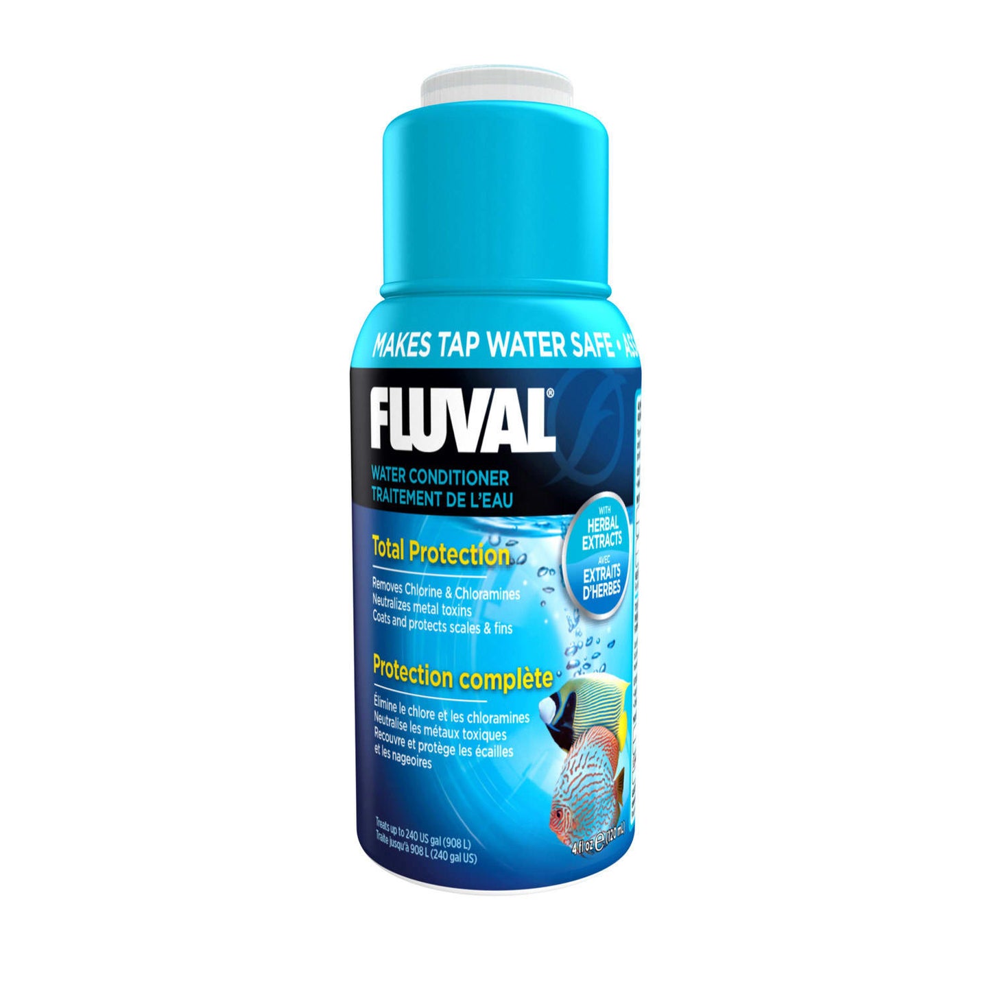 Fluval Water Conditioner makes tapwater safe for tropical fish by neutralizing chlorine chloramine and undesirable metals in aquarium water. Formulated with pure herbal extracts it also visibly reduces stress in fish caused by transportation handling and acclimatization. Fluval Water Conditioner also coats scales and fins to protect against scrapes and cuts.