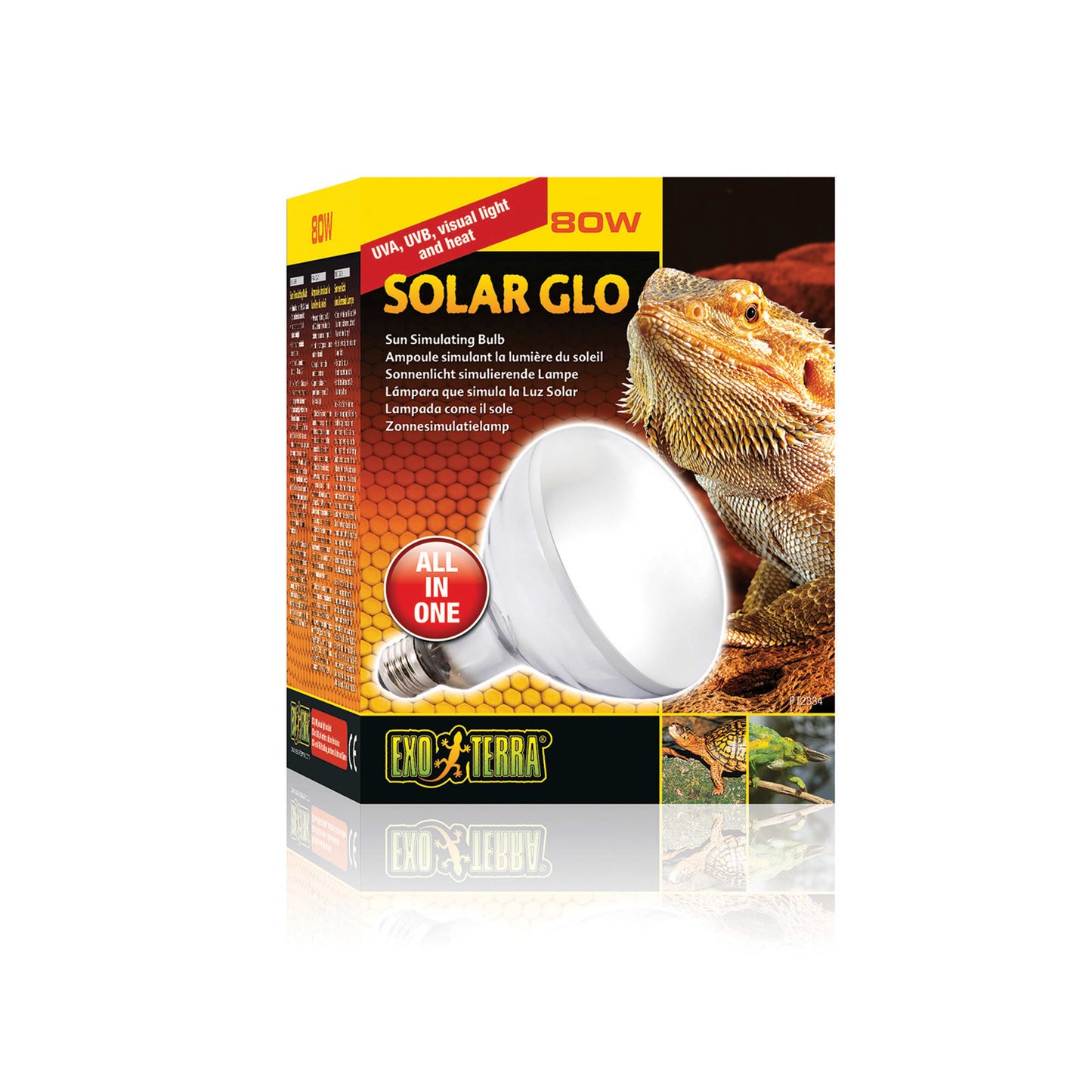 Optimal levels of UVB UVA visual light and heat in one bulb! Provides the benefits of natural sunlight Helps prevent metabolic bone disease Increased UVB penetration distance (+30 cm / 12?) The Exo Terra Solar Glo is a selfballasted mercury vapor reptile bulb that provides the benefits of natural sunlight which is one of the most important aspects in keeping reptiles healthy. The Exo Terra Solar Glo is the choice of professional breeders as it provides the proper balance of ultraviolet light (including UVA and UVB) visual light and infrared light (heat) in one easy-to-install bulb. The Exo Terra Solar Glo is a full spectrum light with carefully tuned peaks to ensure appetite activity brilliant colours and optimal calcium absorption through Vitamin D3 production. The Exo Terra Solar Glo is a selfballasted mercury vapour lamp which fits into a standard ceramic socket (No ballast needed). The Exo Terra Solar Glo is available in three wattages: 80W 125W and 160W.