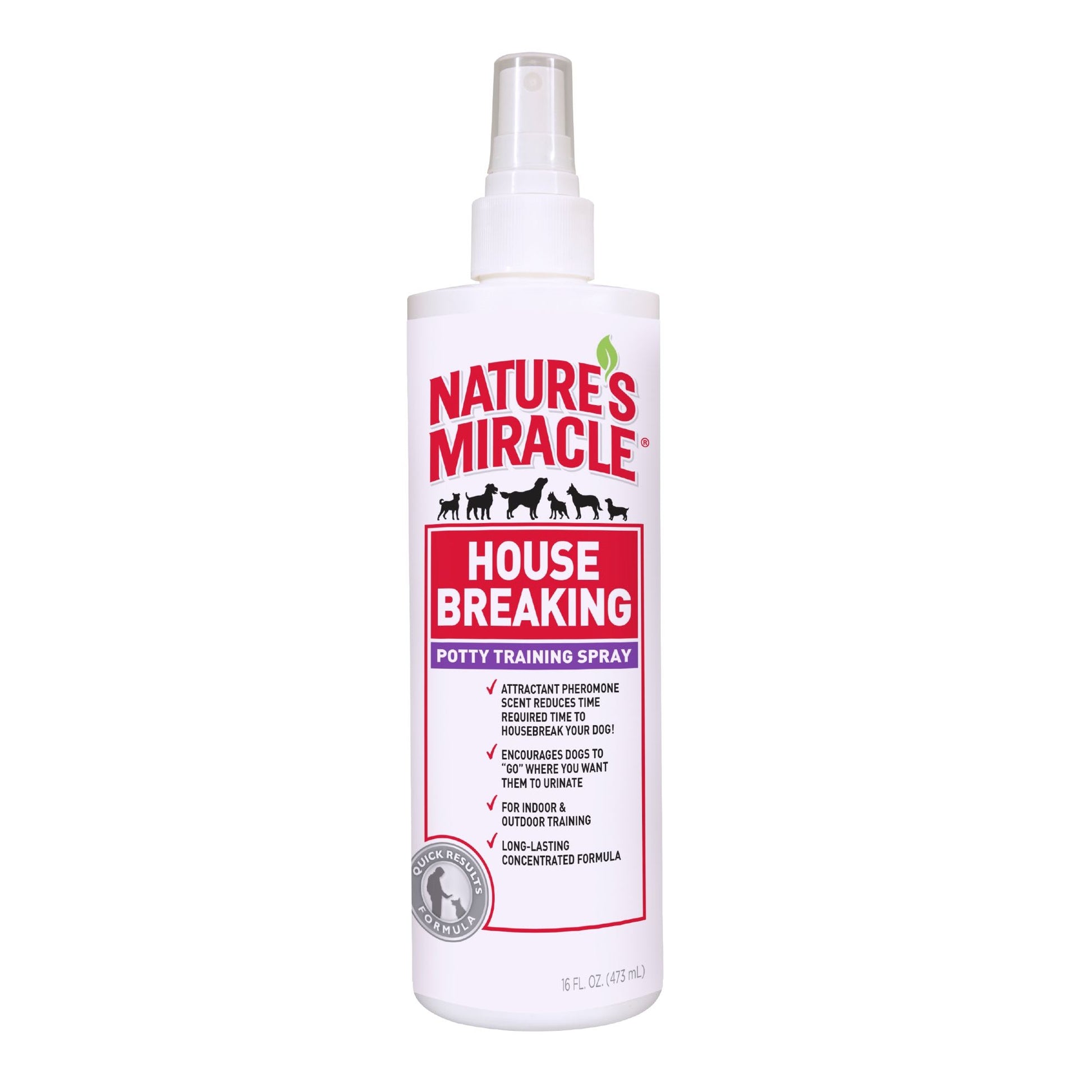 Nature s Miracle pet stain and odor removers. Whatever pets do you can trust Nature s Miracle stain and odor removers training aids disinfectants and litter products to undo. Sometimes your pup needs a little help in the training department. Nature s Miracle House-Breaking Potty Training Spray is specially formulated to help train dogs to relieve themselves where you want them to. Phenomenal scents detectable only by a dog s delicate senses act as a signal telling dogs it s okay to on the spot you have sprayed. Designed for both indoor and outdoor use. To use indoors hold the spray nozzle 1 inch from the surface where you want your dog to. Spray a circle approximately 2 inches in diameter. Lead your dog to the spot and allow him/her to sniff the spot. Your dog will soon realize that this is the approved place to. To use housebreaking spray outdoors spray on areas where you want your dog to eliminate. Repeat the process frequently while your dog is being trained particularly upon awakening before ret