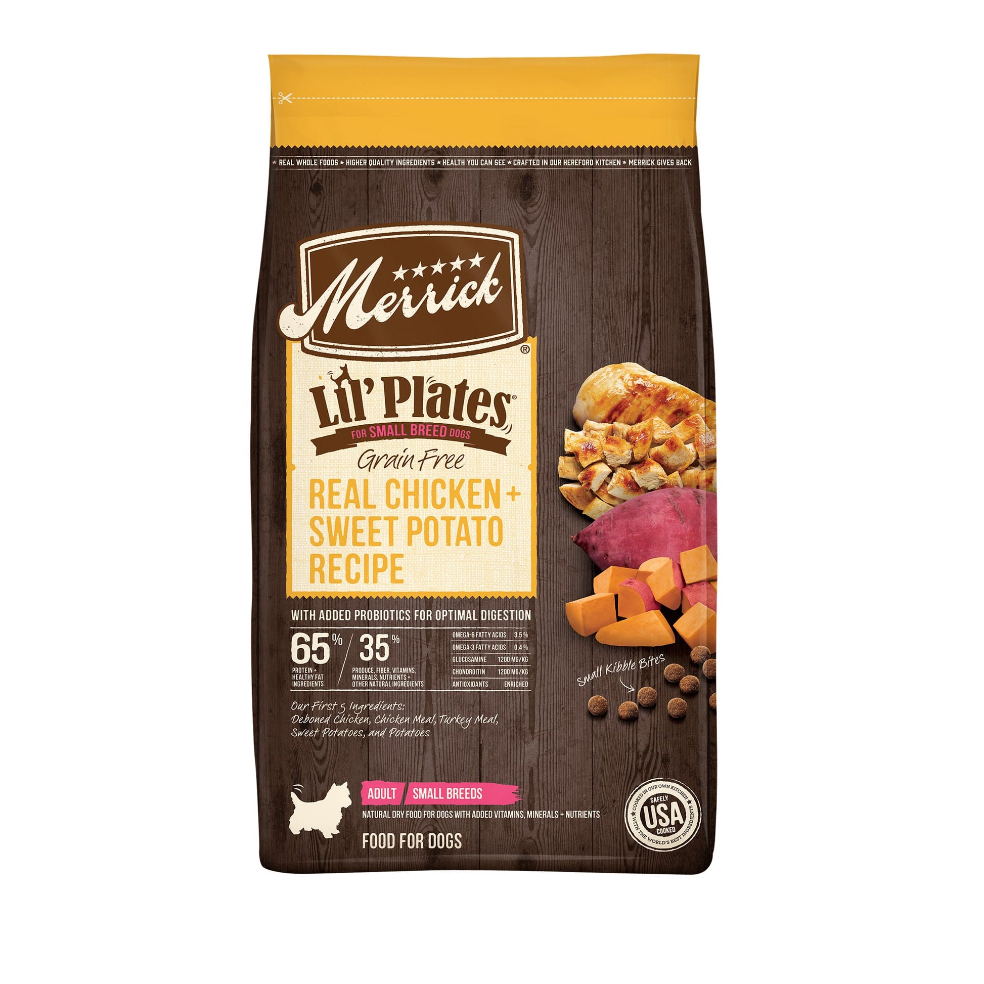 Merrick Lil Plates Grain-Free Real Chicken + Sweet Potato Recipe Small Breed Dry Dog Food Merrick prides itself on making wholesome all-natural pet food from locally sourced ingredients in its own Texas kitchens. Packed with high quality protein healthy fats vitamins minerals and antioxidants Merrick recipes contain no additives sweeteners artificial colors preservatives or fillers. Merrick Grain-Free Real Chicken + Sweet Potato Recipe contains deboned chicken turkey meal sweet potatoes and vegetables. It is high in protein and has omega fatty acids to help support a healthy coat. Ingredients: Deboned Chicken Chicken Meal Turkey Meal Sweet Potatoes Potatoes Peas Natural Flavor Chicken Fat (preserved with mixed tocopherols) Salmon Meal Apples Blueberries Flaxseed Oil Inulin (from chicory root) Organic Alfalfa Gelatin Salt Minerals (Zinc Sulfate Iron Amino Acid Complex Zinc Amino Acid Complex Manganese Amino Acid Complex Copper Amino Acid Complex Potassium Iodide Cobalt Amino