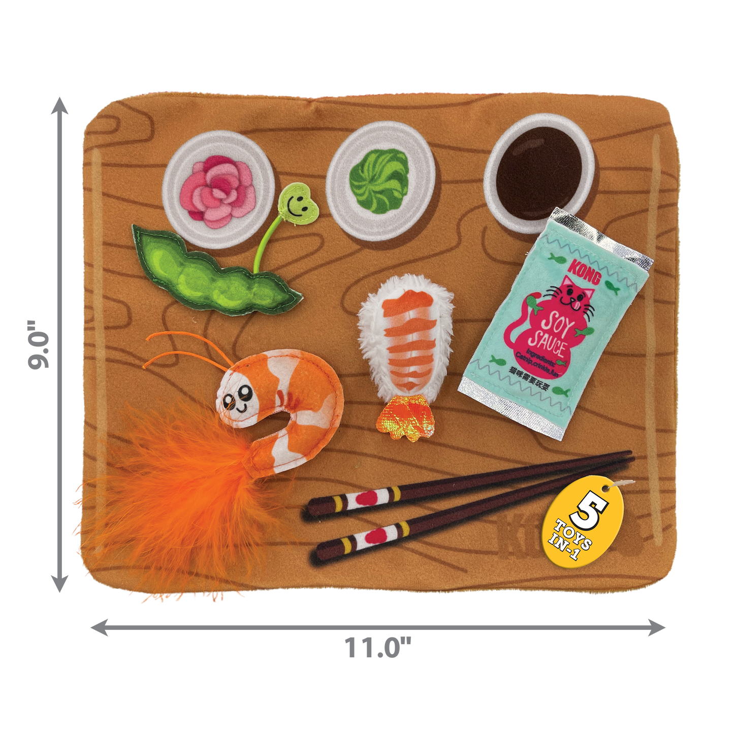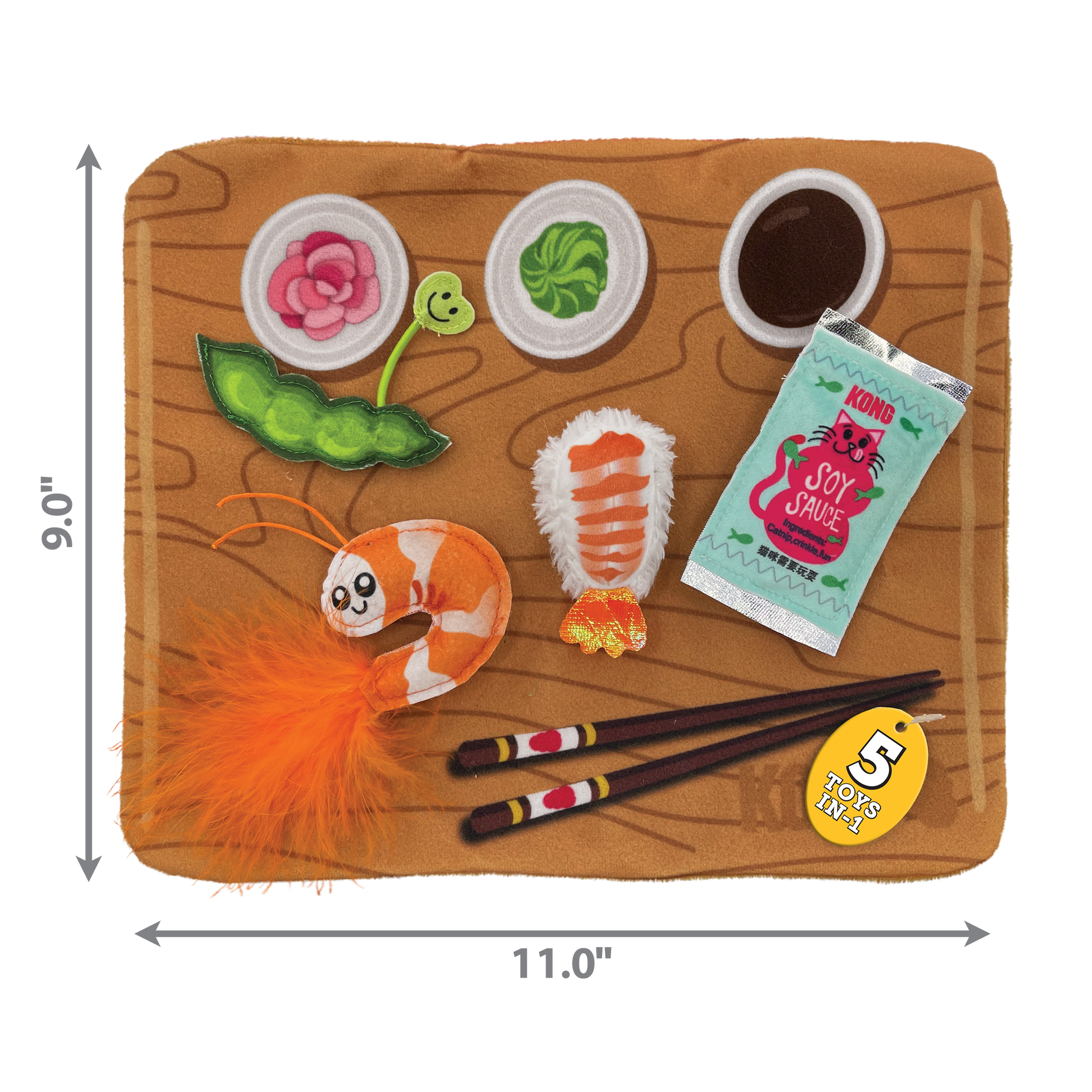 KONG Pull-A-Partz Sushi’s 5-toys-in-1 deliver an endless feast of multi-sensory fun based on a crinkly sushi board that invites healthy wrestling. Pulling edamame, shrimp and soy sauce from hook-and-closure patches satisfies dismantling instincts while each lightweight, bat-table toy inspires play with KONG Premium North American Catnip inside, extending the action.