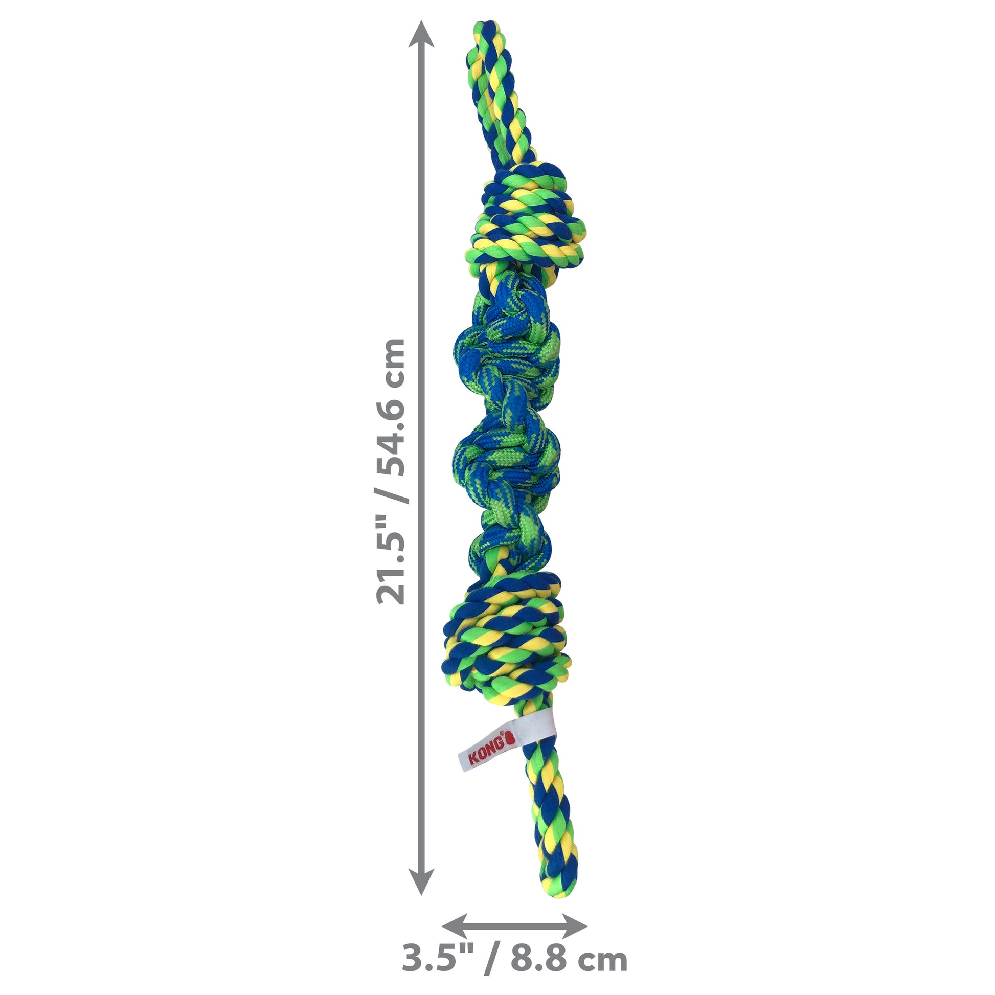 KONG Rope Bunji’s internal elastic bungee cord adds dynamic spring for extra-fun tugging and tossing with this durable, knotted, twisted rope toy. Two easy-grab loops deliver interactive ease while the bungee softens the tugging motion. Ideal for indoor and outdoor action.