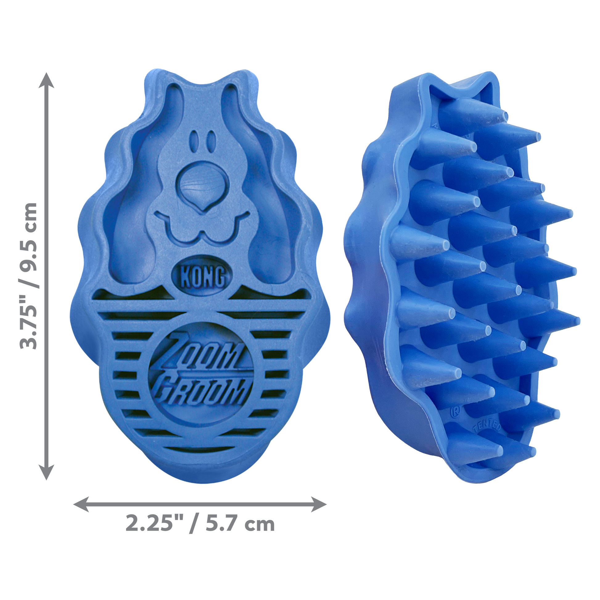 The KONG ZoomGroom™ helps make it easier to get your dogs clean. While shampooing use the ZoomGroom™ to clean your dogs’ coat. The 3/4 inch rubber fingers reach through the coat to massage the skin, stimulating capillaries and natural oil production leading to a healthy coat for your dog.