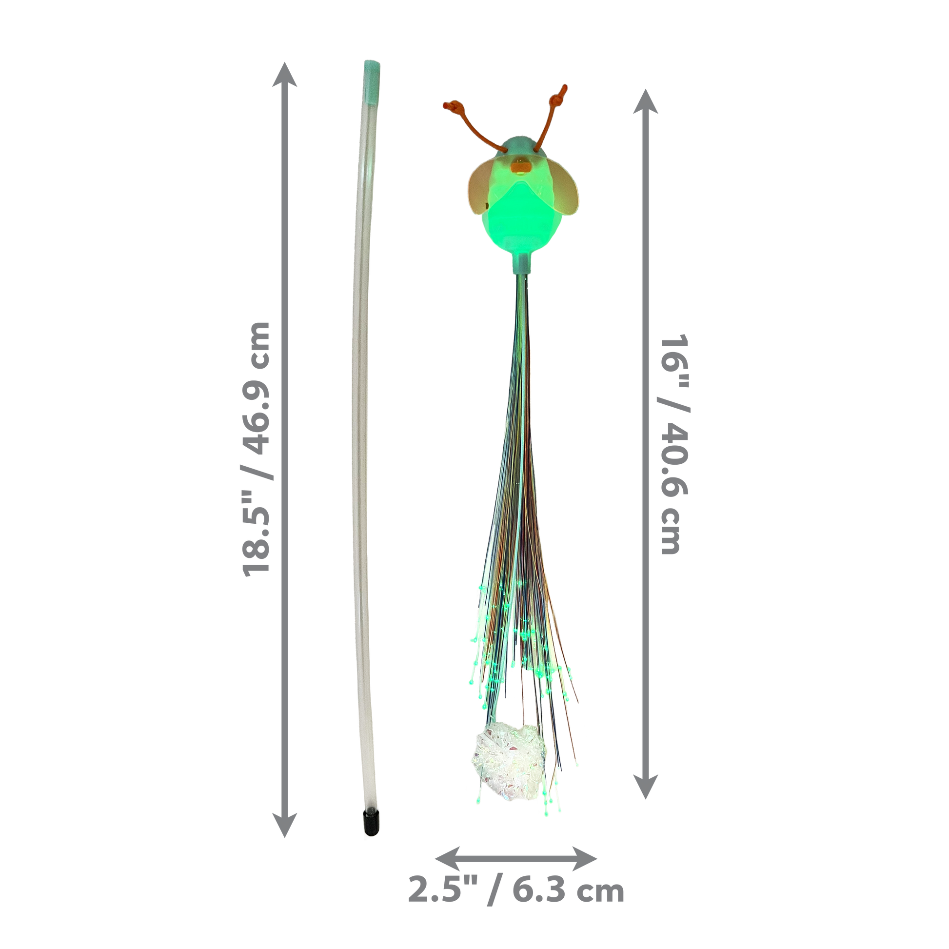 KONG Glow Firefly Teaser’s long, swaying strands light up to spark hunting instincts—especially when enjoyed in the dark. Dangling crinkle ball gives cats a batting target, while wings and antennae add extra allure. A long wand helps extend the fun and playful action. Batteries included.