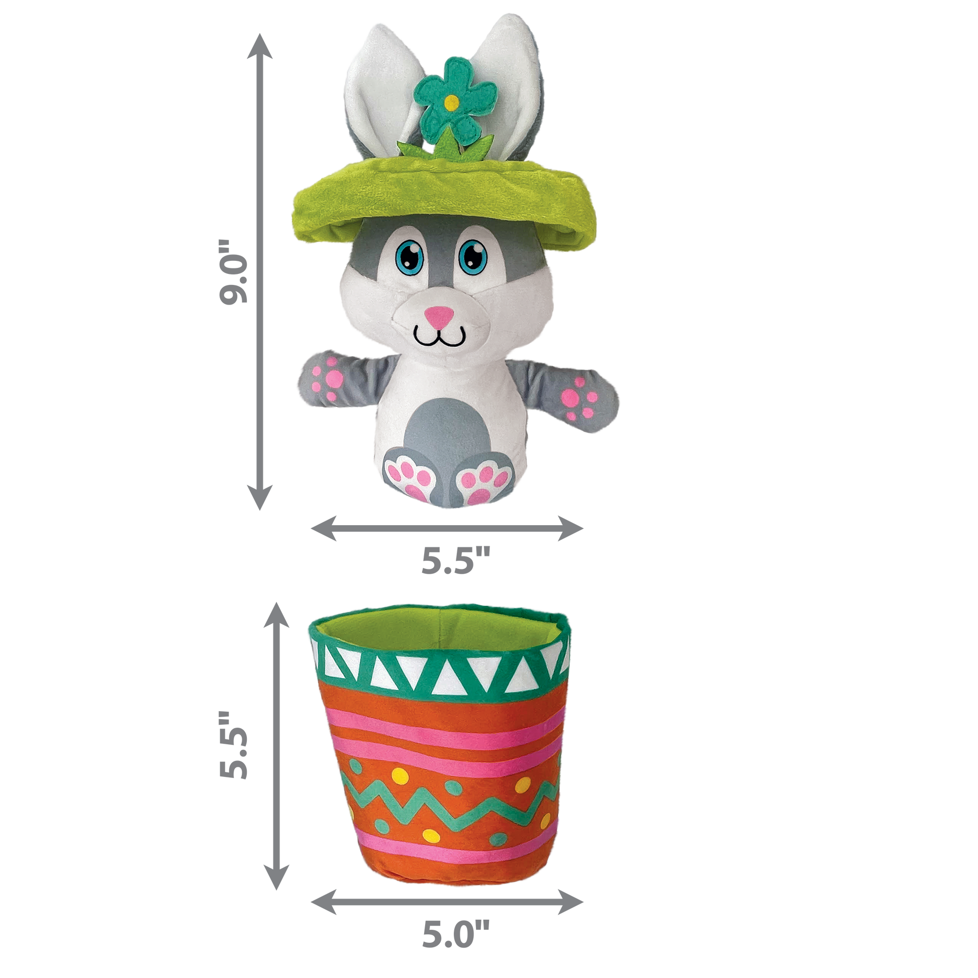 KONG Puzzlements™ Surprise Flower Pot offers 2 toys in 1 to reward natural foraging instincts and invite gentle toss play. Dogs pull the long ears and are delighted to extract a whole plush bunny. The flower pot crinkles and bunny squeaks to prolong play with hidden pal who lets dogs uncover the fun.