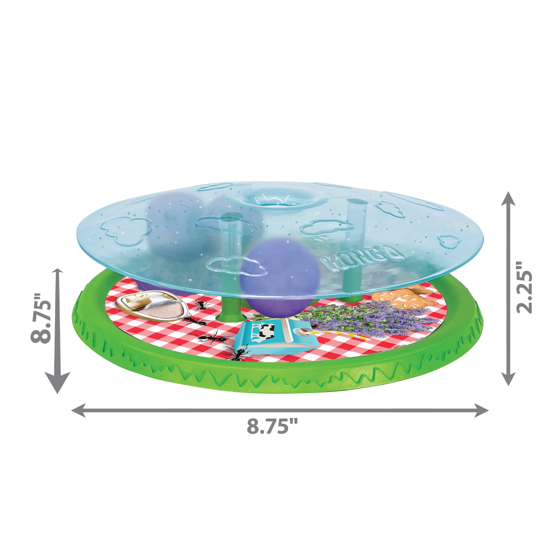 KONG Rewards Picnic delights cats with a dynamic challenge that satisfies batting instincts as they extract treats between moving ping pong balls contained in the tray. Load goodies from the top, through the translucent cover that reveals irresistibly rolling balls and tempting treats. Bottom rubber grippers hold the toy in place during bouts of batting.