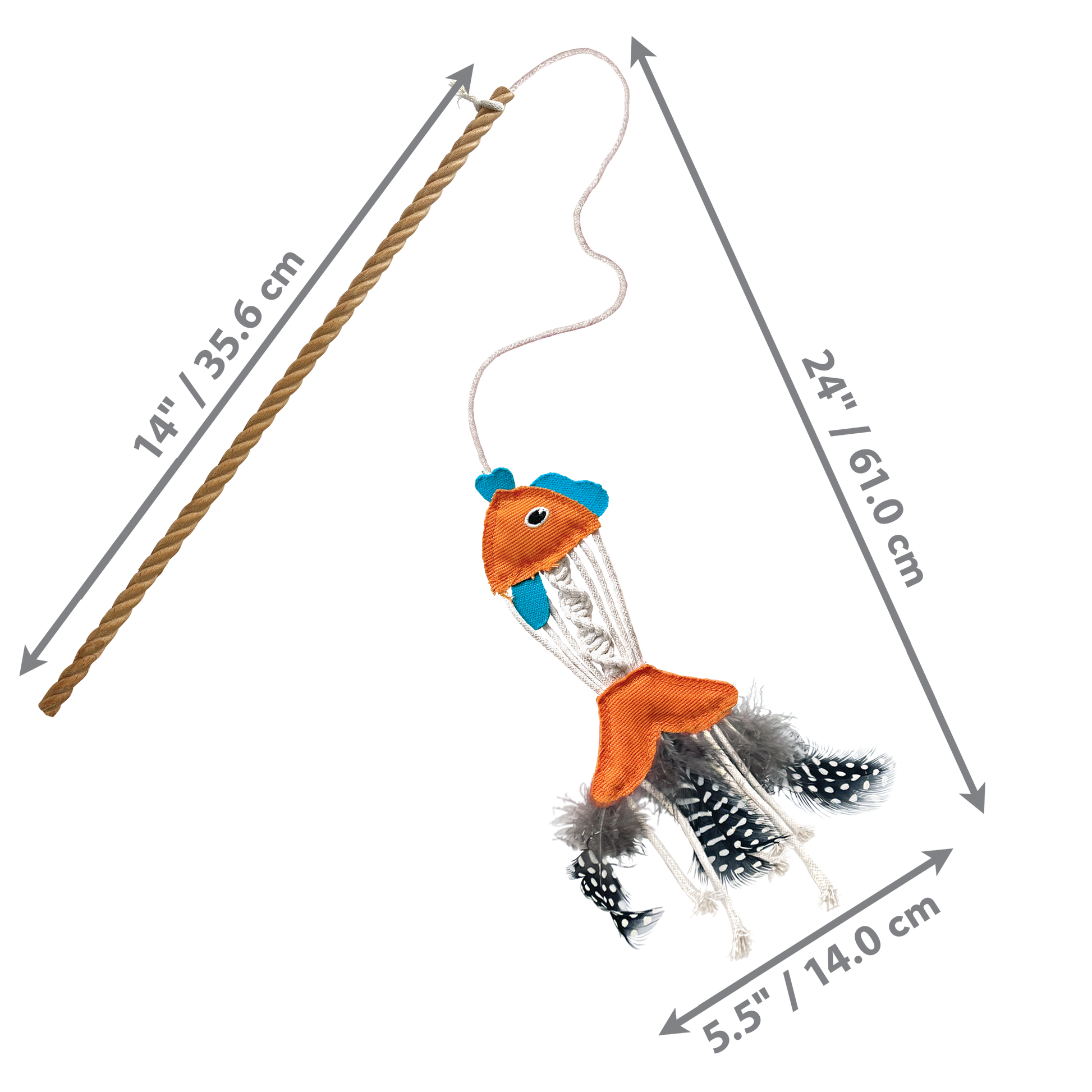 KONG Naturals Teaser Fish lures cats to play with a dangling fiesta of natural features that satisfy hunting instincts. Feathers flutter irresistibly for batting, the cotton canvas fish twists and turns for grabbing and dangling cotton rope strands spark pouncing. The twisted wood wand enhances the action, maximizing healthy exercise. KONG North American Premium Catnip in head and tail keeps this fishing expedition going.