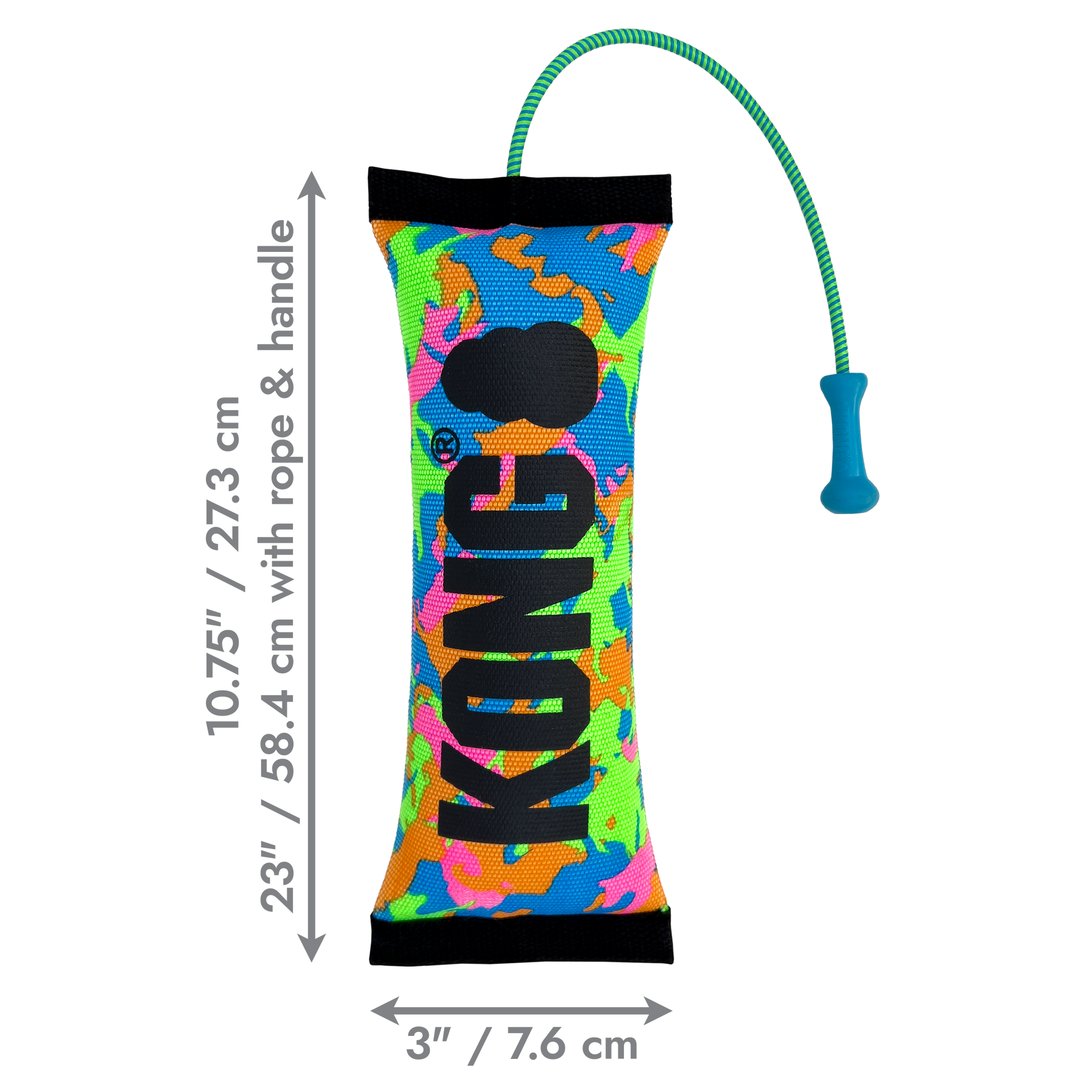 The KONG Bunji High-Viz Bumper is specially designed with bright colors and contrasting patterns for high visibility in various environments, weather, and terrain. Heavy duty firehose material, webbing-sealed edges, and bungee rope makes this toy perfect for energetic fetch-and-retrieve play. The squeaker engages natural instincts during play sessions, while the ergonomic rope & handle design effortlessly launches at long distances, saving your shoulder from burnout!
