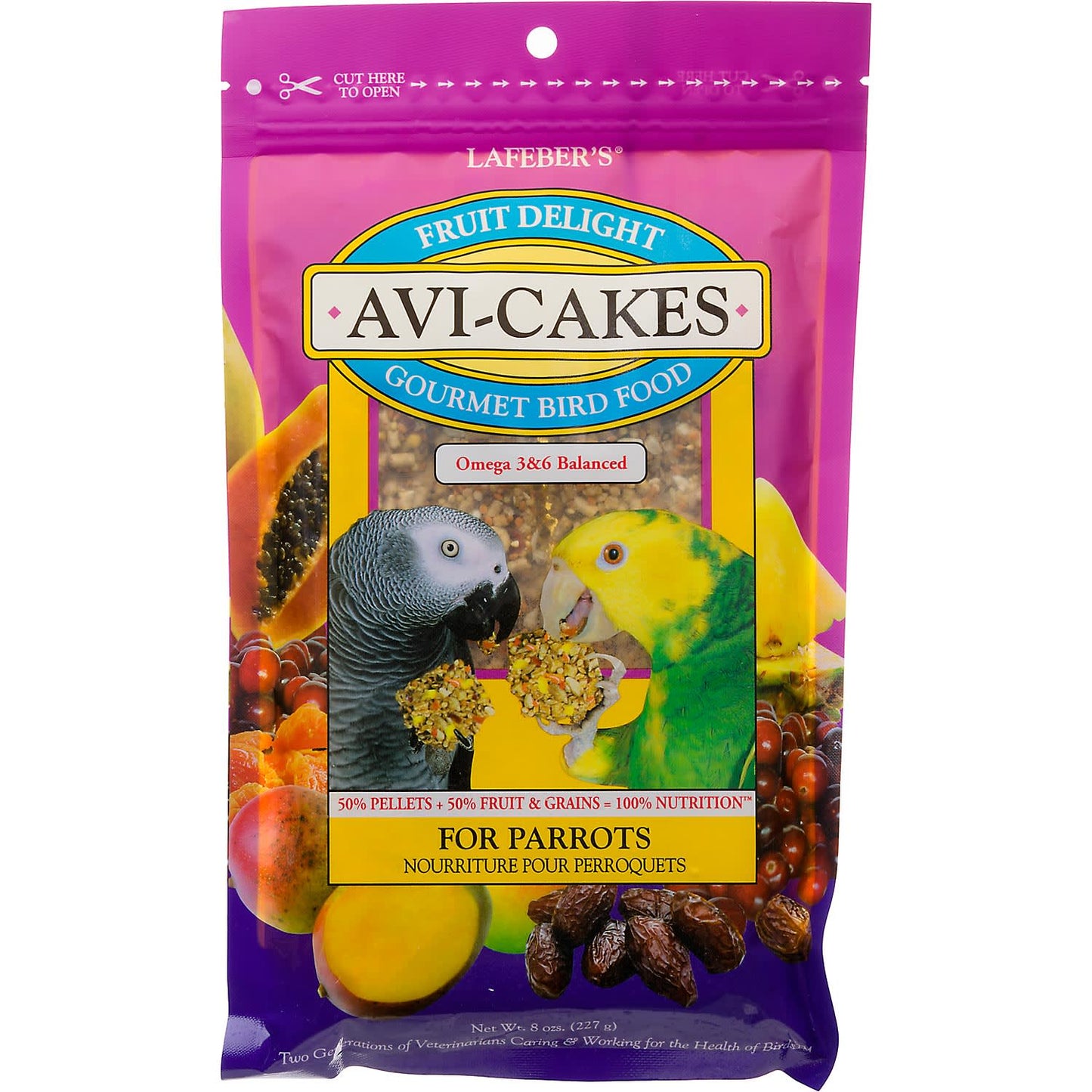 Lafeber Avi?Cakes for Parrots Fruit Delight Benefit from the knowledge and experience of two generations of veterinarians caring for birds and small mammals with Lafeber Company. Help your parrot thrive with Lafeber Fruit Delight Avi-Cakes Gourmet Bird Food for Parrots. Your parrot will love this food made of real pieces of cranberries dates mango papaya and pineapple and wholesome grains as well as 50% pellets. Lafeber Fruit Delight Avi-Cakes Gourmet Bird Food for Parrots composition of 50% pellets makes it the perfect bridge food to wean your bird off of seeds and onto pellets.
