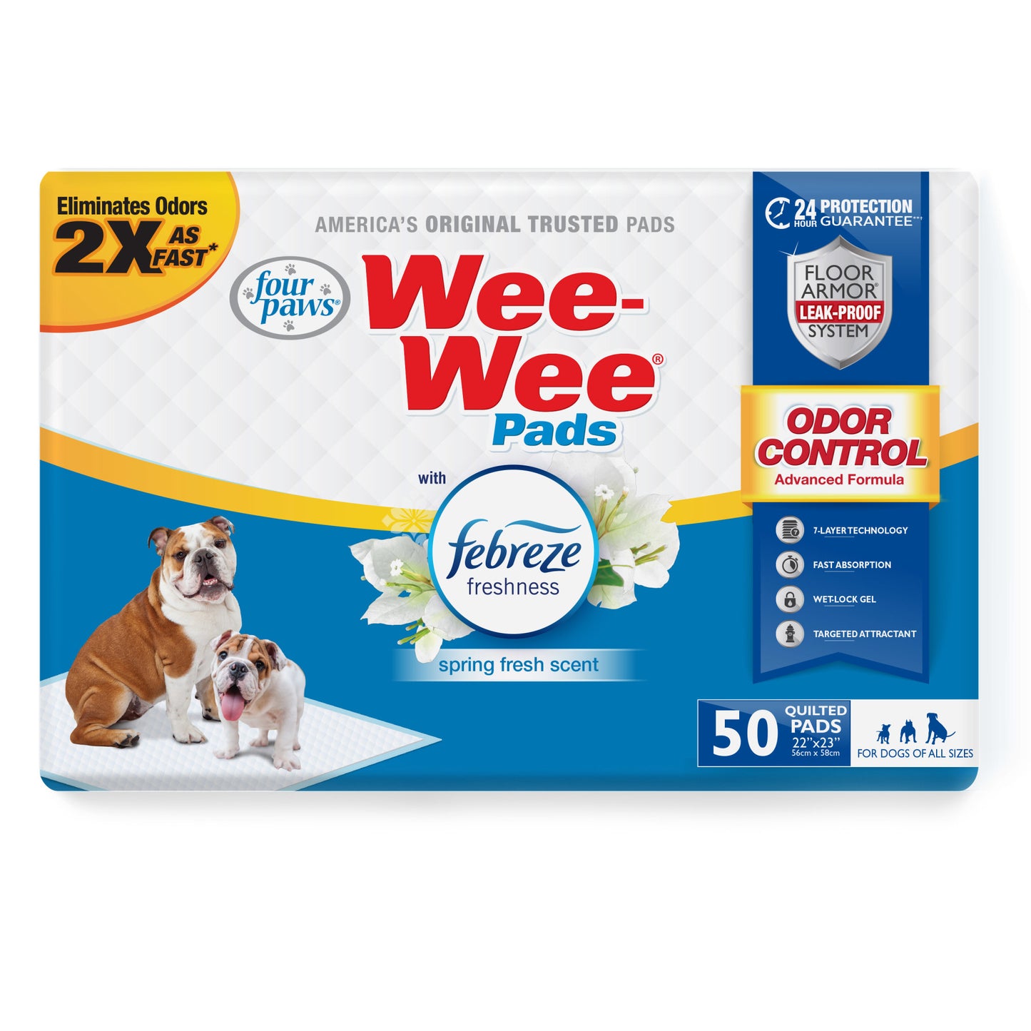 Every pet parent and dog deserves a clean and fresh-smelling home. That s why Four Paws partnered with Febreze to create the ultimate odor-eliminating dog pads. We infused our Wee-Wee Odor Control Pads with Febreze Freshness which eliminates pet smells and provides a fresh spring scent. These dog training pads eliminate pet odors 2x faster than standard pads. Plus the 7-layer leak-proof technology with new oversized quilted pockets guarantees 24-hour wetness protection. These new Wee-Wee Pads for dogs make housetraining and cleanup a breeze!