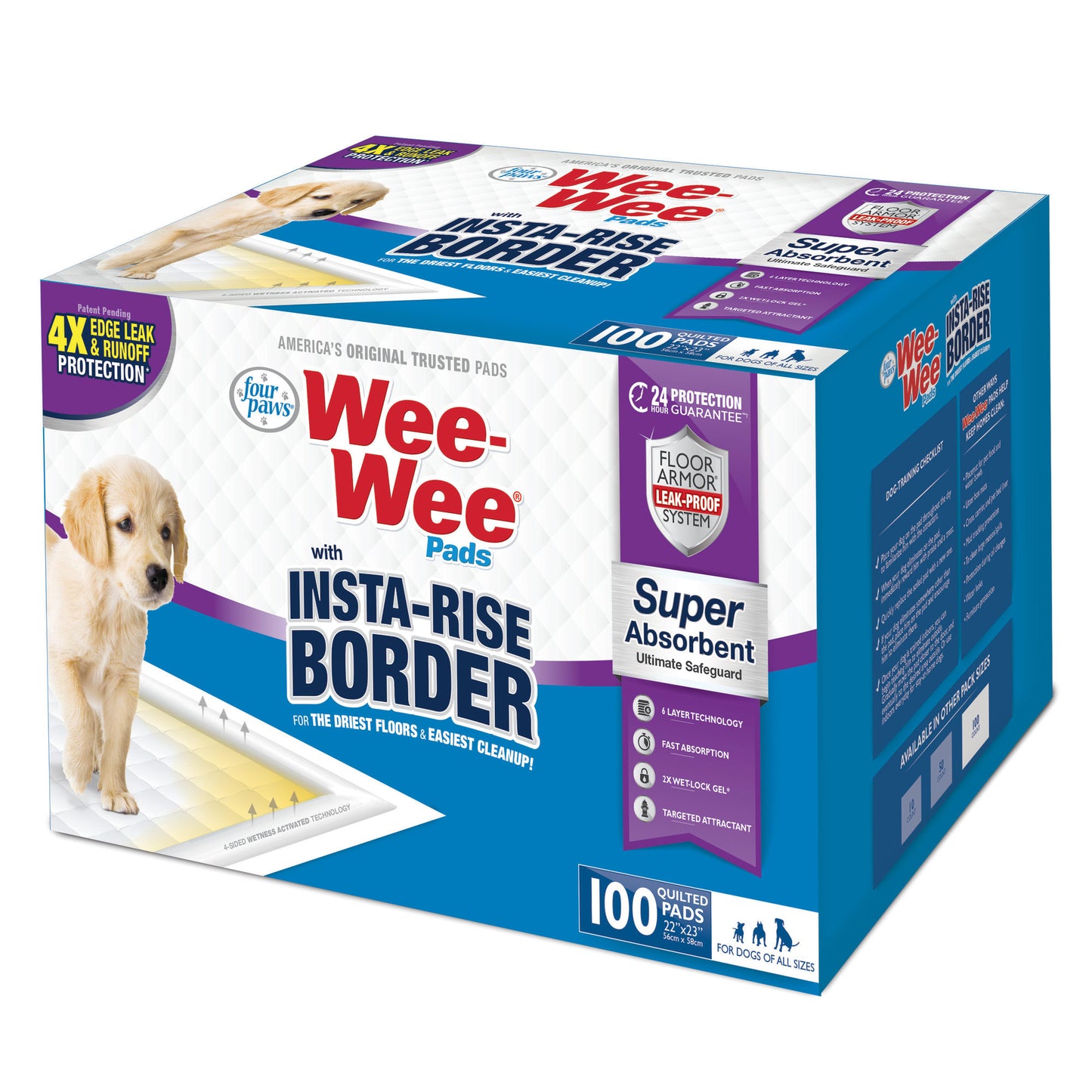 America s Original Trusted Pads are more advanced than ever! Four Paws Wee-Wee Pads with Insta-Rise Border are a first-of-their-kind waste management solution. These dog training pads feature a patent-pending 4-sided wetness-activated border that rises when exposed to liquids. The result? Four times the edge leak and runoff protection! Complete with the high-performance Floor Armor Leak-Proof System and maximum absorption technology each dog pee pad guarantees 24 hour protection for the easiest cleanup and driest floors possible! Providing even more peace of mind dual action wet-lock gel absorbs fluids and odors while over-sized rapid dry quilt pockets increase fluid absorption capacity. Plus these 6-layer housetraining pads include targeted attractant to draw your dog to the pad. Made for any dog of any size these large Wee-Wee Pads are perfect for puppy potty training and beyond!