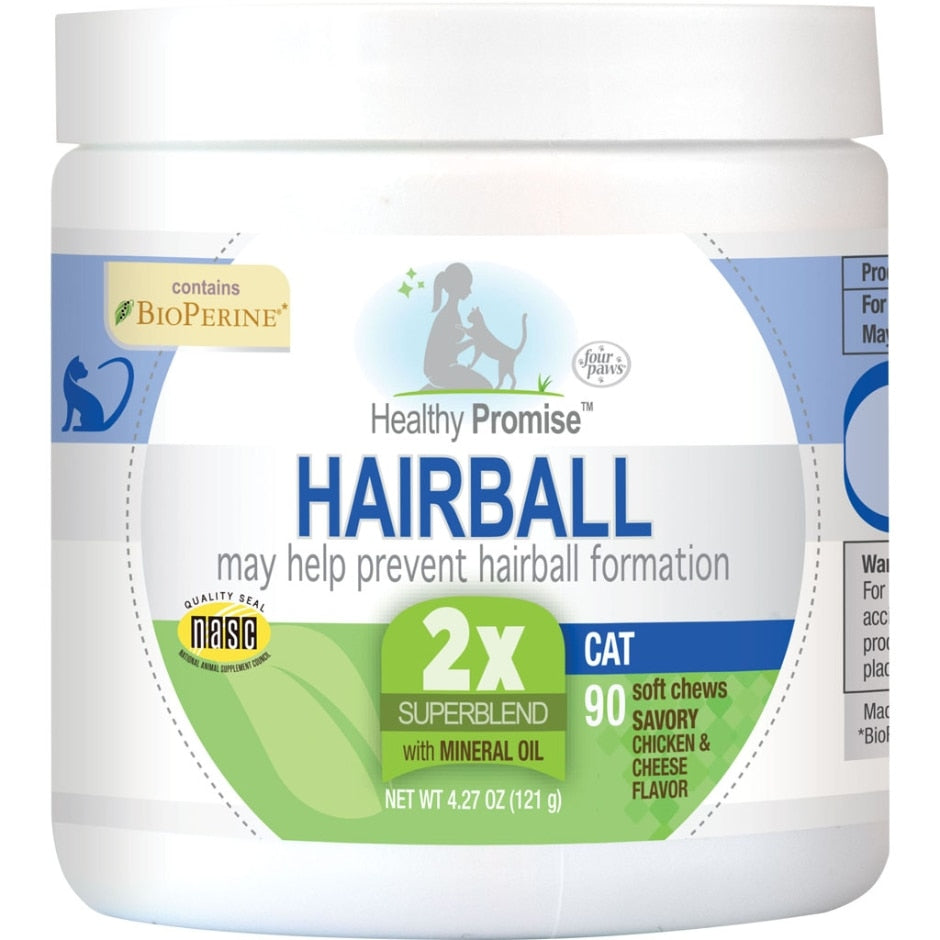 Four Paws has been helping pet parents and four-legged family members flourish together for 50 years. Driven by the passion to keep our furry best friends thriving happily Healthy Promise supplements and healing & care products help provide our pets a healthy active and fulfilling life. Hairball Control soft chews for cats feature delicious chicken & cheese flavor and may help prevent hairball formation. If left unchecked hairballs can affect your cat?s health and even lead to intestinal blockage. That?s why these hairball control supplements feature a 2x SuperBlend including Mineral Oil known for its hairball prevention properties and BioPerine a black pepper extract known to assist faster nutrient absorption and help support the chew?s overall effectiveness. Healthy Promise supplements proudly carry the National Animal Supplement Council (NASC) Quality Seal which is earned for complying with stringent quality control standards ingredient reviews and much more. Add Healthy Promise USA-made pet