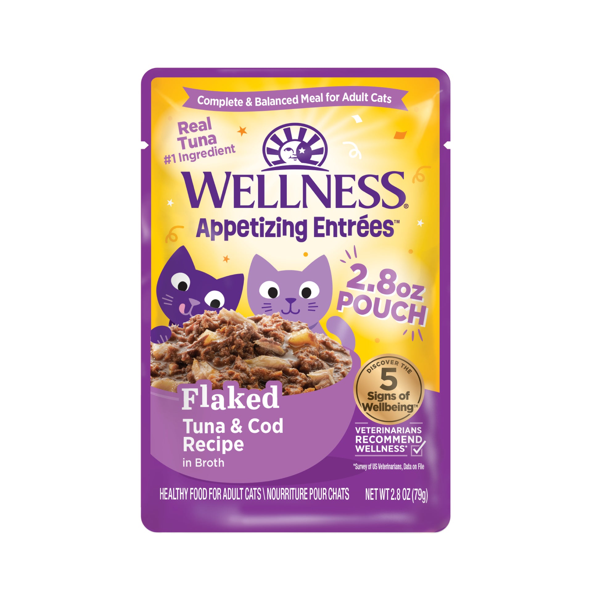 MOUTHWATERING MEALS CATS CRAVE: Delicious, protein-rich meals featuring real tuna as the #1 ingredient now in 2.8 oz pouches. More bites for more purrs! COMPLETE & BALANCED MEAL: Wellness® Appetizing Entrées™ offers complete and balanced nutrition for adult cats and is crafted with real, high-quality, natural* ingredients. *with added vitamins, minerals & taurine SUPPORTS HEALTHY HYDRATION: Moisture-rich meals made with delicious broth to support cat’s daily hydration VARIETY OF FORMS & FLAVORS: Mix & match between mouth-watering recipes and different forms to support your cat’s daily nutrition VETERANIARIAN RECOMMENDED**: Each recipe is crafted to support the 5 Signs of Wellbeing™: Sustained Energy, Highly Digestible, Healthy Skin & Coat, Immune Health, and Healthy Teeth & Bones **Survey of US Veterinarians. Data on File.