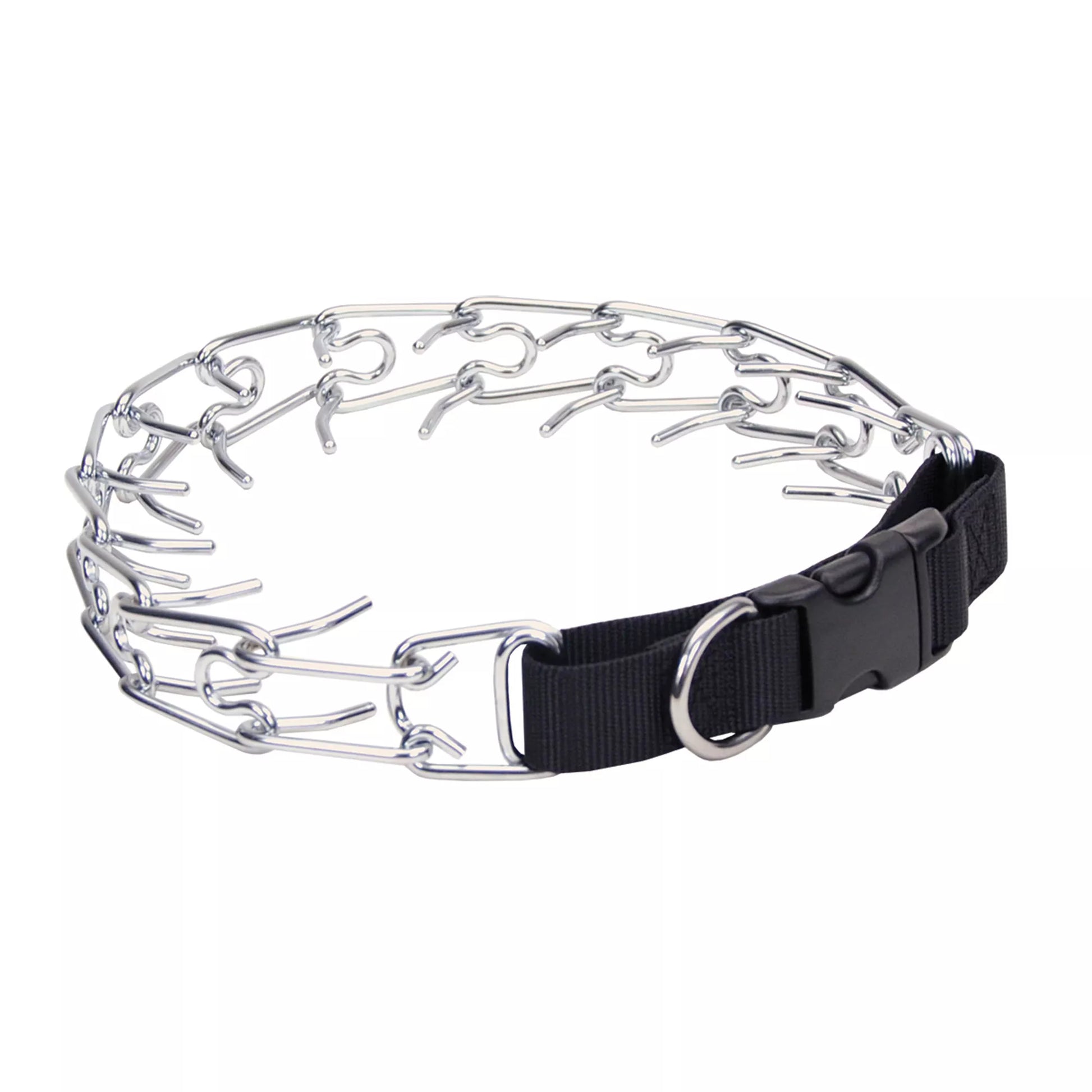 Introducing the Titan® Easy-On Dog Prong Training Collar with Buckle, a training tool that combines strength and convenience to help you and your furry friend achieve your training goals. Crafted from electric welded, chrome-plated steel, this collar is engineered for maximum strength and durability. It's built to last, ensuring that it won't tarnish, break, or rust over time. The added convenience of a buckle makes it easy to put on and take off, simplifying the training process for both you and your dog. When used correctly, this prong training collar is a safe and effective tool to aid in training your pet. However, please note that it is not suitable for use as a tie-out collar, as safety should always be the top priority. The Titan® Easy-On Dog Prong Training Collar with Buckle is designed to be the ideal training collar for your furry companion. Invest in this reliable and durable tool, and pave the way for effective training sessions that strengthen the bond between you and your pet.