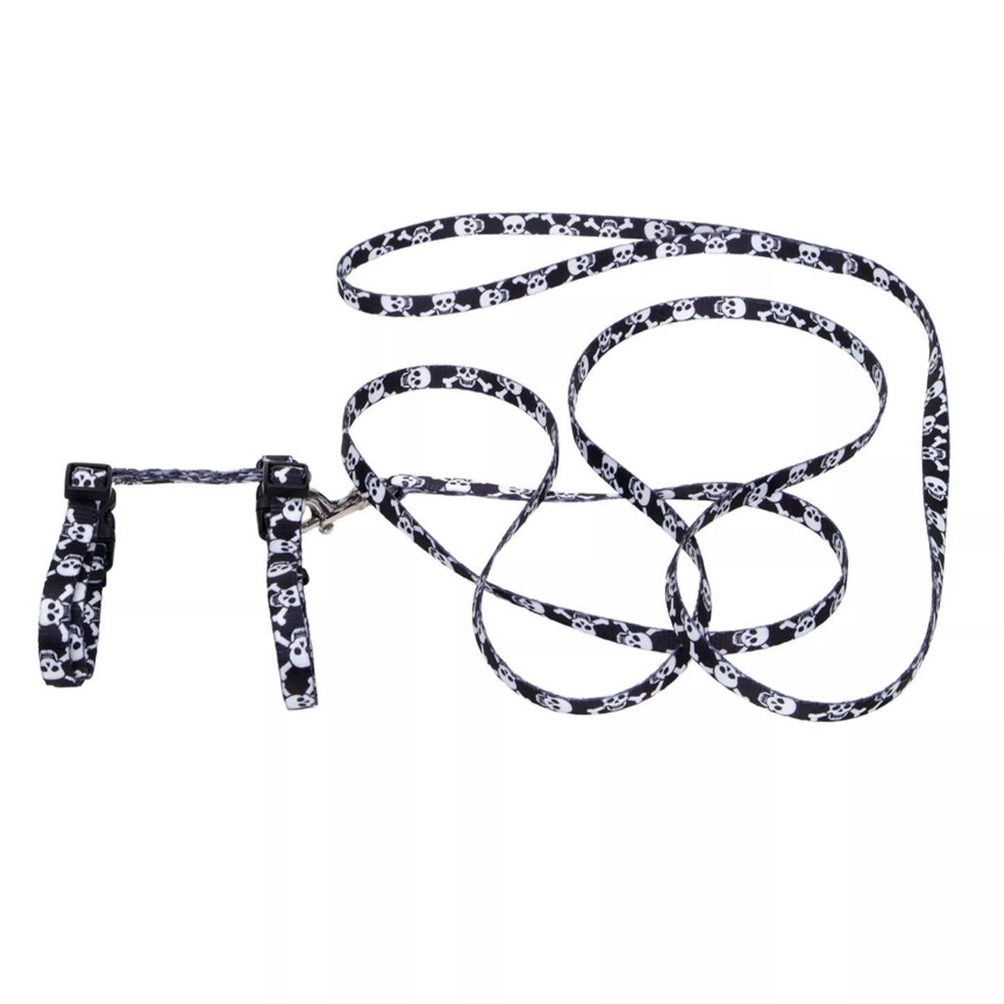 Coastal Figure "H" Fashion 3/8in Wide 10-18in Adjustable Cat Harness and Leash Combo Black Skulls