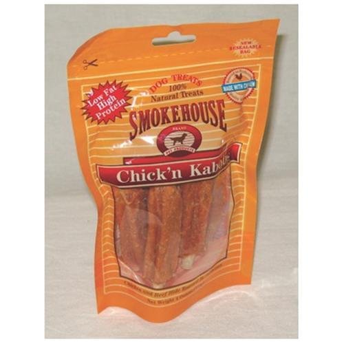 Product DescriptionSmokehouse Chick n Kabobs are a fun unique treat sure to get your dog s tail wagging! On the inside is a chewy rawhide stick and on the outside is delicious ground chicken breast.Key Benefits100% natural treatsRoasted to perfectionLow in fat high in proteinGreat for any size dog See all items by Smokehouse ?