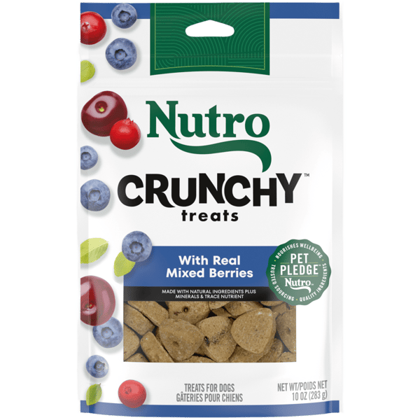 We understand that pet owners want the best for their dogs. That’s why Nutro has a partnership with trusted farmers and suppliers to source high-quality ingredients, serving your dog nutrition both you and your pet will appreciate. Nutro Crunchy Dog Treats With Real Mixed Berries are dog treats rich in nutrients, full of flavor and have 5 calories per treat, making them great for training and rewarding. Made with a high-quality protein source and real mixed berries, these dog treats contain natural ingredients plus minerals and trace nutrients. Plus, they're made with non-GMO ingredients and have no chicken by-product meal, corn, wheat, or soy. Crafted with no artificial flavors or colors, although trace amounts may be present due to potential cross-contact during manufacturing, you can be confident you’re giving your dog something they will love with Nutro Crunchy Dog Treats.