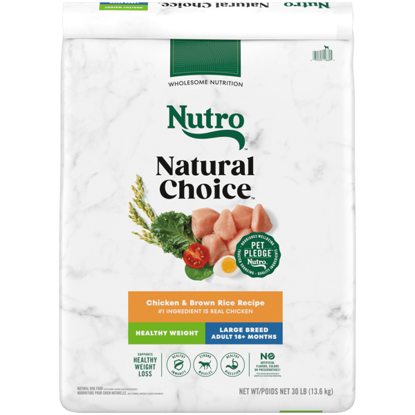 We understand that pet owners want the best for their dogs. That’s why Nutro has a partnership with trusted farmers and suppliers to source high-quality ingredients, giving your dog quality nutrition both you and your pet will appreciate. Made with chicken as the #1 ingredient, and crafted with vitamins, minerals, and other nutrients, Nutro Natural Choice Adult Large Breed Healthy Weight Dry Dog Food, Chicken and Brown Rice Recipe brings real, recognizable ingredients to every mealtime. Crafted with a blend of protein & fiber, this dry dog food supports healthy weight loss. Plus, it's made with non-GMO ingredients and has no chicken by-product meal, corn, wheat, or soy. With ingredients that promote healthy skin and coat, digestion, and immunity, this large breed dry dog food recipe also supports your dog’s vitality. Packed with delicious flavor, high quality ingredients, and supportive benefits, serve your furry loved one something they will love with Nutro Natural Choice Dry Dog Food Recipes.