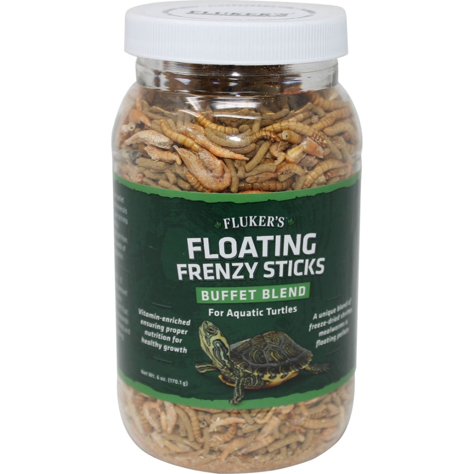 Flukers Floating Frenzy Sticks Buffet Blend provides a premium pellet and insect blend for all aquatic turtles with all the vitamins and minerals they need. This food features a unique blend of freeze-dried river shrimp and freeze-dried mealworms plus vitamin-enriched pellets and is specially formulated to provide your pet with optimal balanced nutrition. The vitamin-enriched floating sticks meet all the daily dietary needs of aquatic turtles and have a taste that turtles love for easy acceptance. Delicious Taste Turtles Love Vitamin-Enriched Ensuring Proper Nutrition for Healthy Growth Made in the USA with insects from China Vitamin-Enriched Floating Sticks Meet all of Your Turtles Daily Dietary Needs Delicious Freeze-Dried River Shrimp & Mealworms INSTRUCTIONS: Feed to juvenile or adult aquatic turtles 1-2 times per day 6 times per week. For best results feed only the amount that the turtles will consume in 5 minutes. Flukers Floating Frenzy Sticks Buffet Blend should be scattered on the water where it