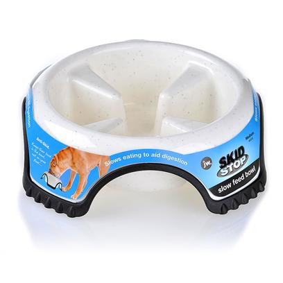Petmate JW Skid Stop Slow Feed Bowl Dog Bowl For more than 50 years Petmate has produced a wide variety of solutions for pets and their families. Nearly all of this eco-friendly company s items are . Prevent problems caused by rapid eating with the Petmate JW Pet Skid Stop Slow Feed Bowl. This bowl has large interior indentations which slow down fast eaters. Its rubbery base keeps the bowl in place. The Petmate JW Pet Skid Stop Slow Feed Bowl is made from dishwasher-safe heavy-duty plastic that resists rust and bacteria.