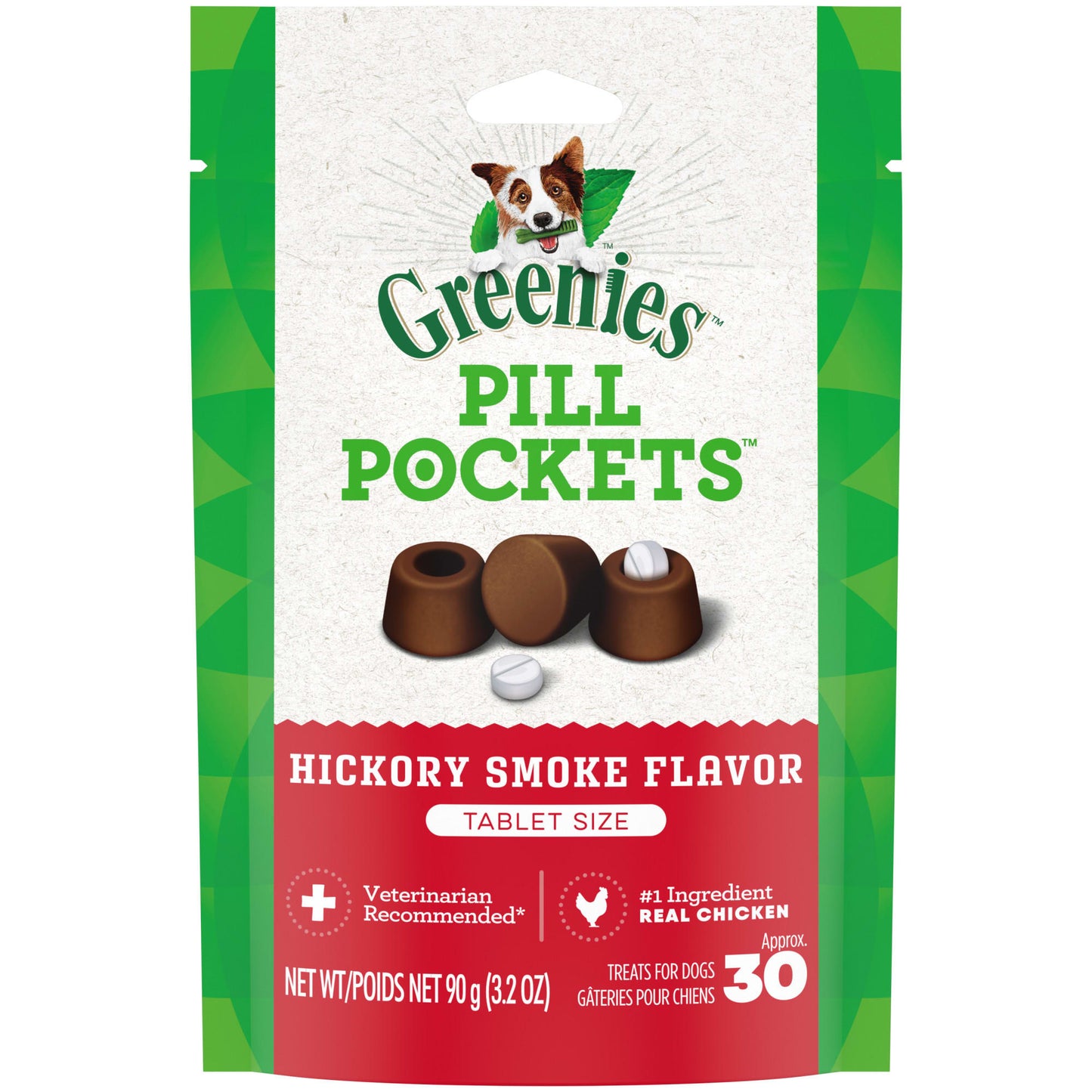 PILL POCKETS TURN PILL TIME INTO TREAT TIME. GREENIES Pill Pockets Treats for Dogs make it easy to give your dog medicine with a tasty hickory smoke flavor they?re sure to love. Why hide your pet?s medicine in human foods like peanut butter or cheese when you can give them a healthy all natural dog treat made with natural real ingredients plus trace nutrients instead? Designed by veterinarians GREENIES Pill Pockets Dog Treats mask the smell and taste of any medicine taking the stress (and mess) out of giving your canine companion medicine. Whether for large breed or small dogs these smaller-sized Pill Pockets for tablets make taking medicine a positive experience for your dog. And they?re easy to give: Simply drop a tablet into the Pill Pockets pouch pinch the top half closed give it to your pup and poof: Watch their medicine disappear. GREENIES Pill Pockets are the ingenious way to give your dog their meds-and they?ll never know the difference. * Data on file at Mars Petcare Inc. 2018