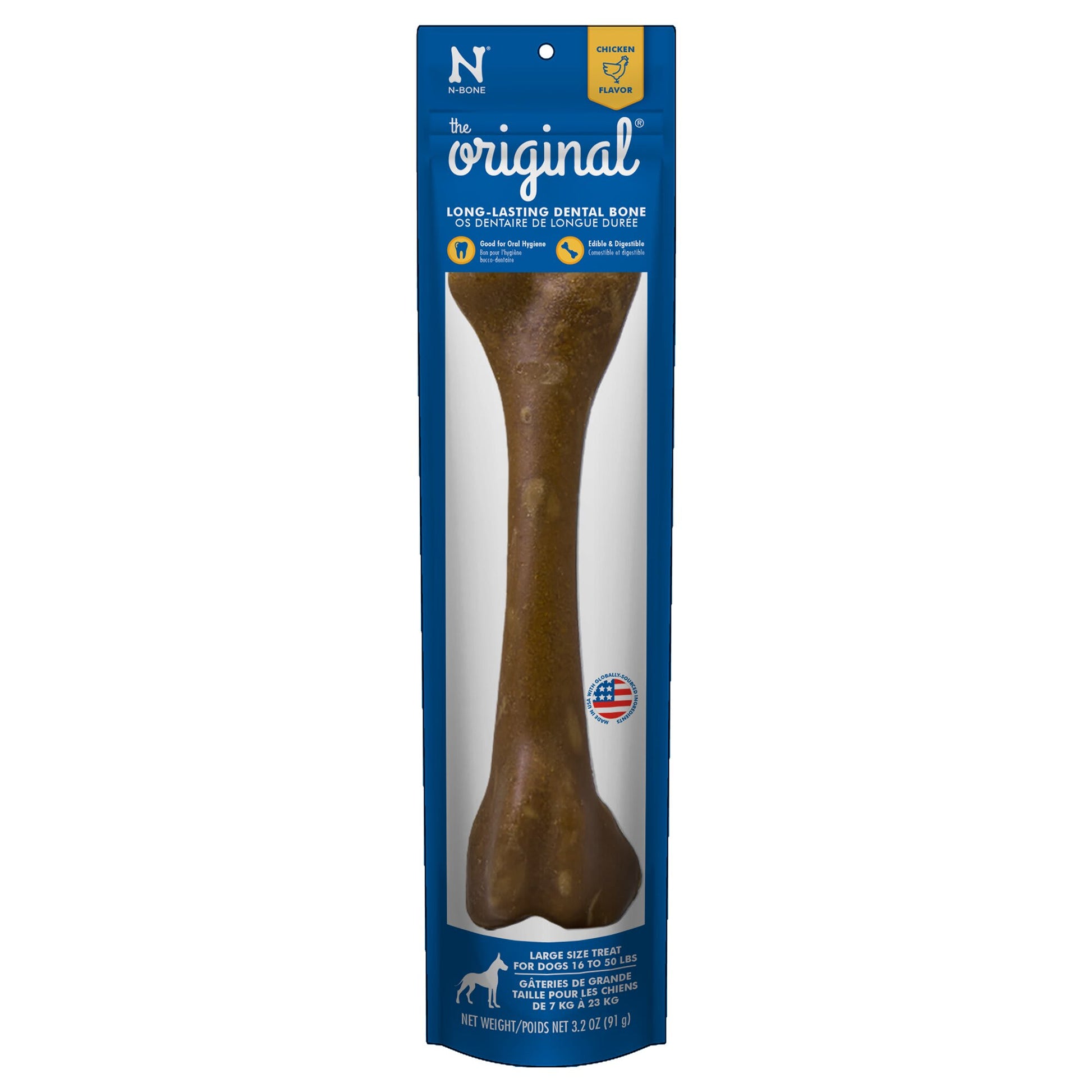The Original N-Bone? Chew Bone for Dogs N-Bone? the Original? chew bones debuted in 1998 as one of the first edible chew bones on the market. Today the same superior quality puts N-Bone? the Original? chew bones heads (and tails) above the competition. Before the N-Bone nylon and rubber were the only alternatives to rawhide. N-Bone is edible and highly digestible so there is none of the worry that comes with rawhide! Our long lasting dental bones help clean your best friend s teeth by removing plaque and tartar as they chew while also freshening their breath. The Original N-Bone? chew bone for dogs is a satisfying and natural way to ensure excellent oral health. Not to mention the delicious chicken flavor will keep them coming back for more!