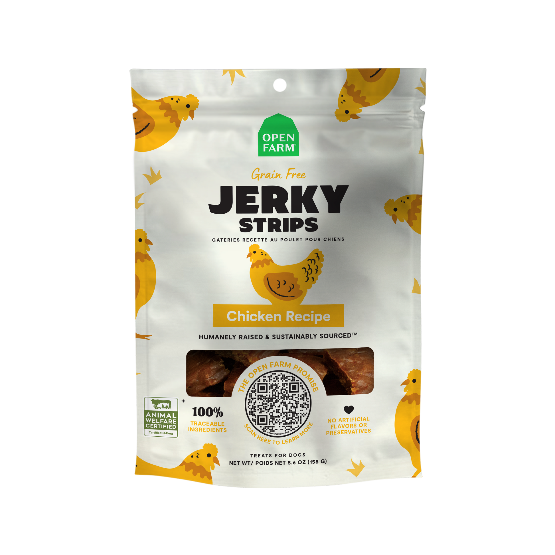 Open Farm chicken jerky strips feature humanely raised chicken to deliver an incredible taste your dog will crave! As with all Open Farm products, our ethically sourced, farm to bowl ingredients are 100% traceable. Our jerky strips are crafted in a way that respects animal welfare and our planet. Approximately 7-8 strips per bag.