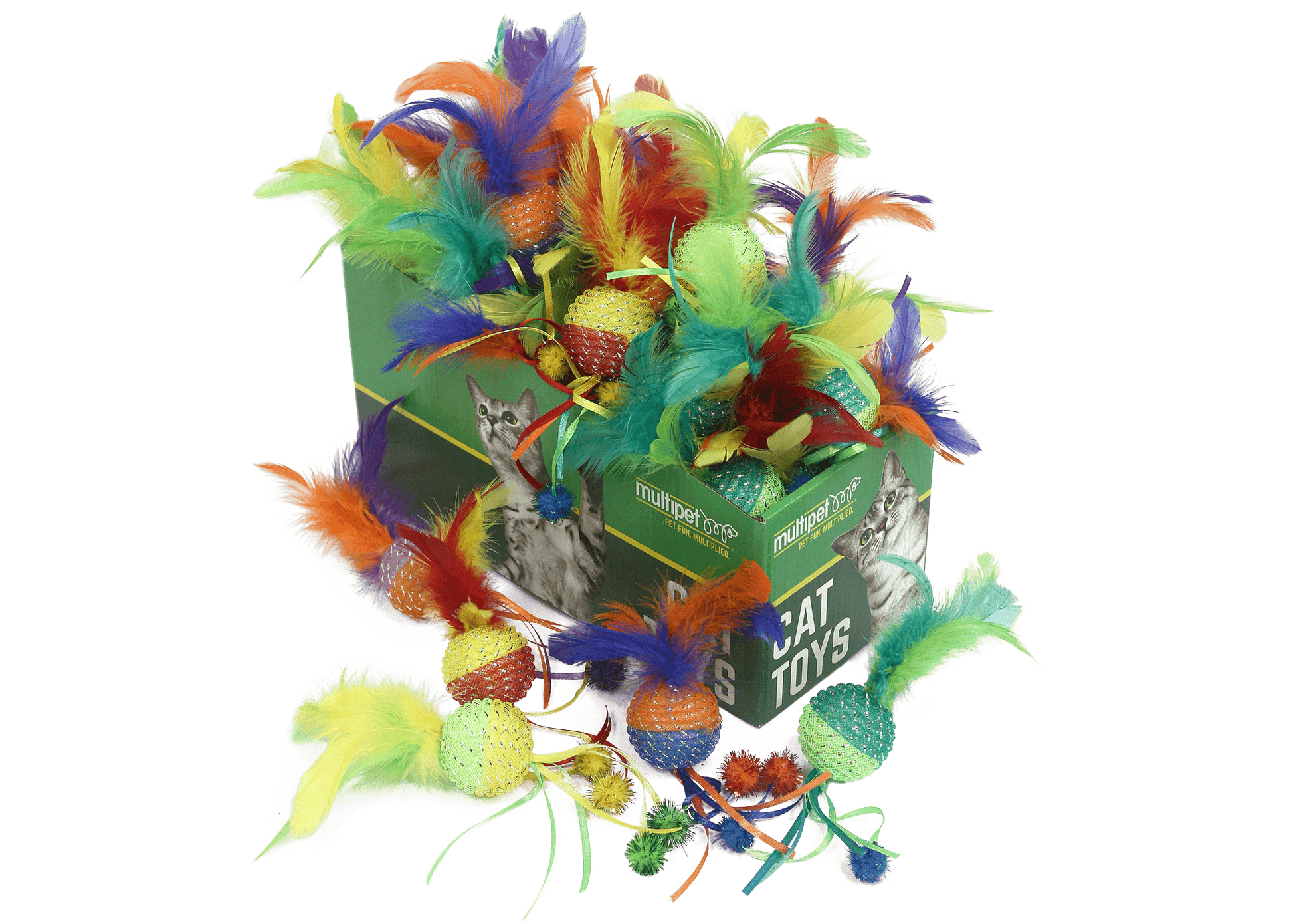 Mesh Ball cat toys are a glittery combination of mesh, feathers and ribbons that will attract cats and encourage play. They are lightweight making them easy to toss and bat. Cats will love the texture and natural feathers.