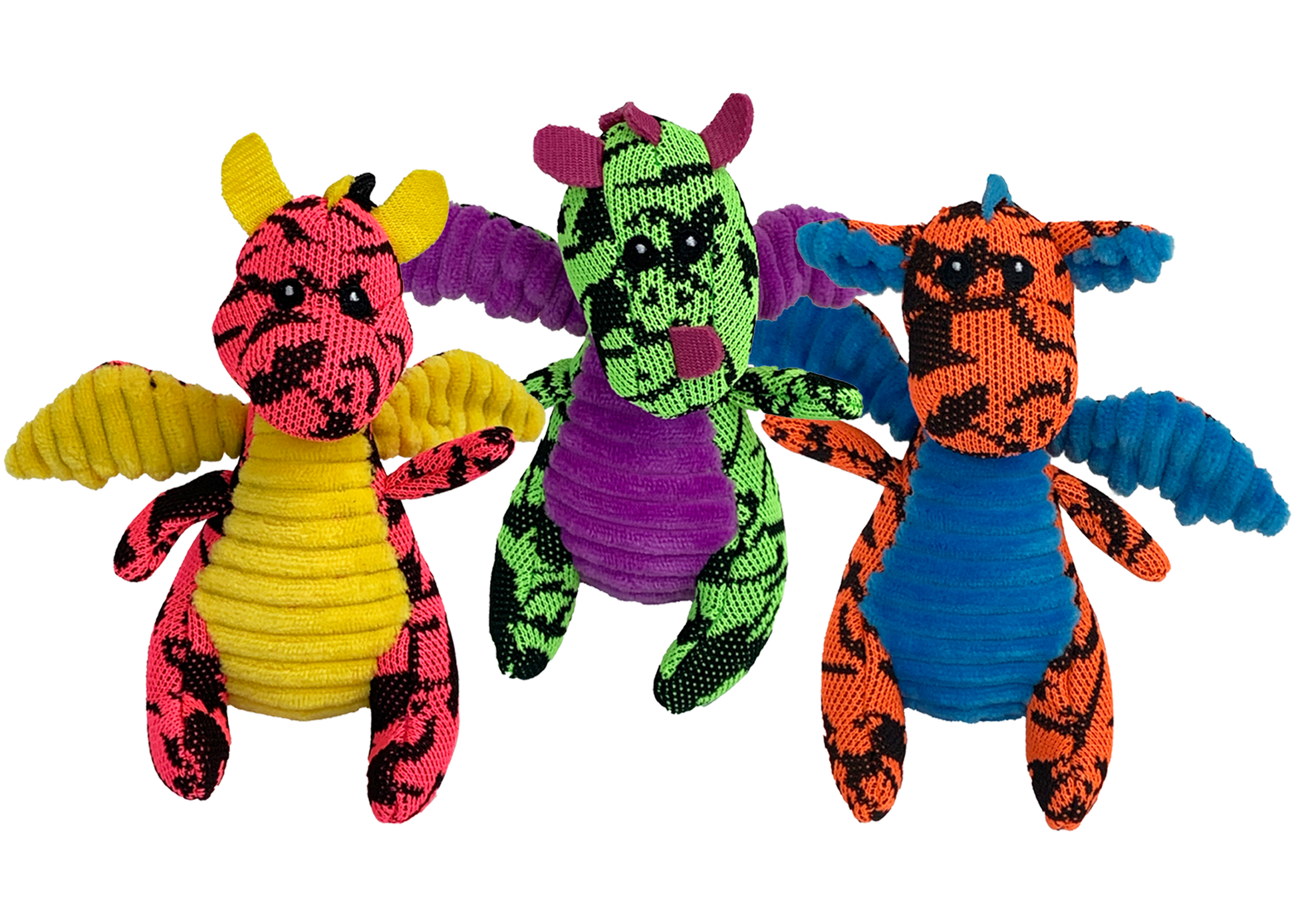 Minipet by Multipet is our line of small toys designed for small dogs, but we know big dogs occasionally love the comfort of a smaller plush toy too! These Mini Dragons come in three bright colors to excite your pup during playtime. Their small size makes them easy to grab, toss, and cuddle! With crinkle material and a squeaker inside, these Mini Dragons are sure to encourage and entice play.