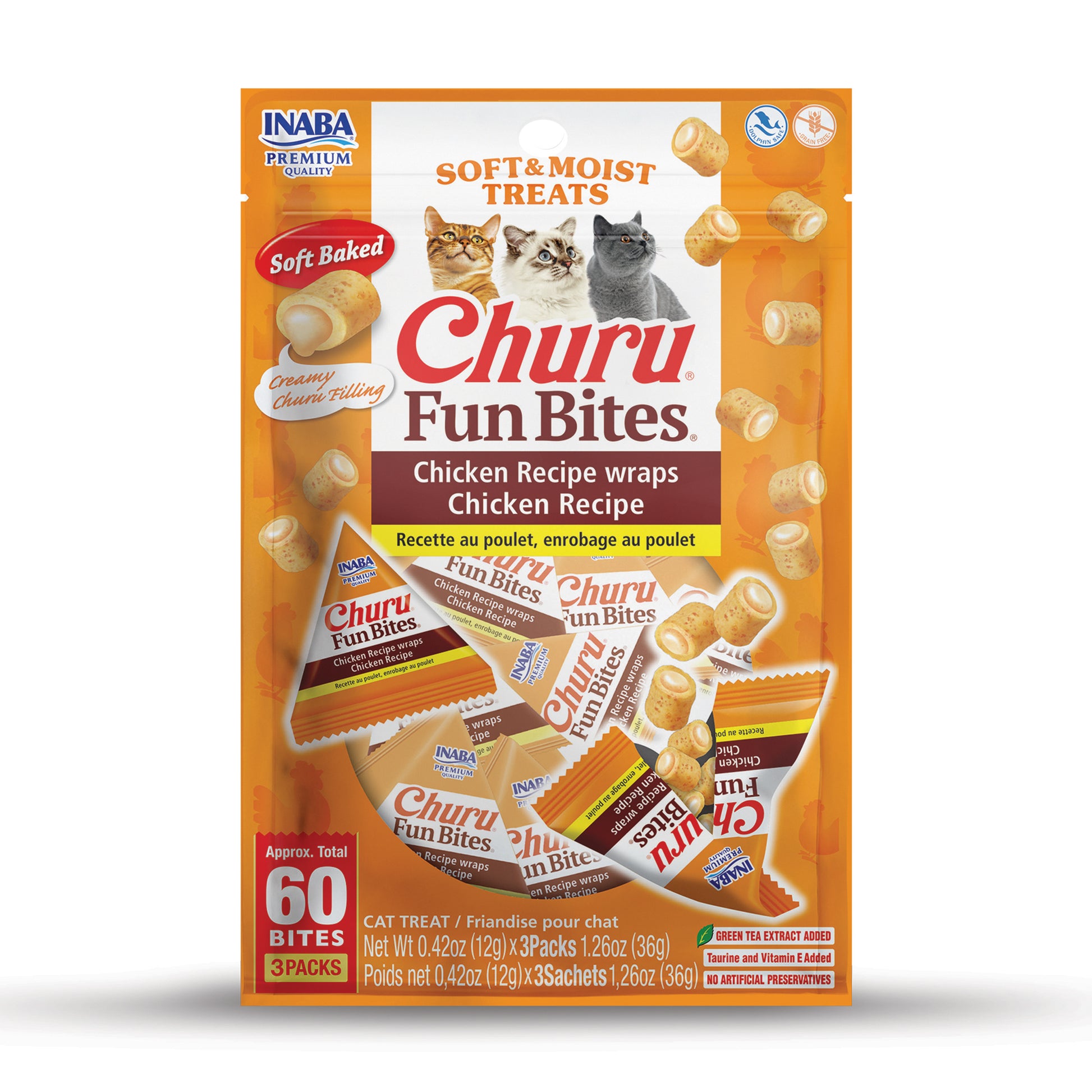 MADE WITH WHOLESOME INGREDIENTS YOU CAN TRUST: Every Inaba product is made with yummy high-quality ingredients including farm-raised chicken and/or natural wild-caught tuna TWICE THE TEXTURE: Each pillow-shaped bite starts with a soft baked chicken paste with no grains, preservatives, carrageenan or artificial colors. Then we've filled the centers with Inaba's delicious Churu filling to give your cat twice the texture TETRA FUN PACKAGE: Each bag contains 3 perfectly portions packs, which helps keep the tasty treats fresh and helps prevent kitty snaccidents PERSNICKETY PUSSY CAT APPROVED: Even the fussiest of cats will devour these bite-sized treats directly from your hand- even if you've used the creamy center to sneak a pill into their special snacks SOFT, SAVORY AND HEALTHY: Each piece contains 69% moisture for hydration and about 17 kcal making these a low-calorie treat you can feel good about feeding. We've also added Vitamin E for immune system support and Green Tea Extract as an antioxidant