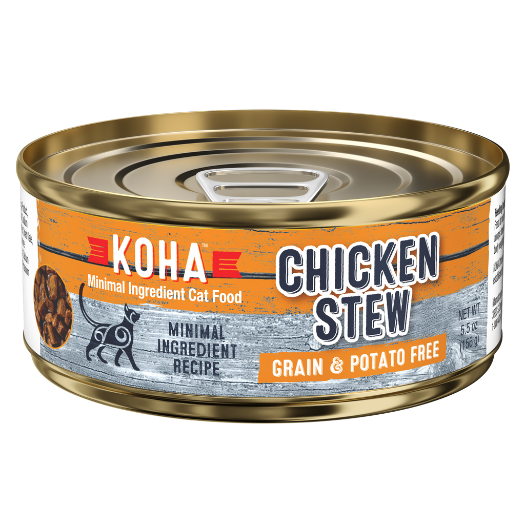 KOHA Minimal Ingredient Chicken Stew for cats is a moisture-rich recipe packed with cuts of meat in a savory gravy. With meat as the first ingredient and no carb-loaded fillers like grains, peas, potatoes, or corn that can lead to digestive issues, KOHA minimal ingredient stews are ideal for cats with food sensitivities.
