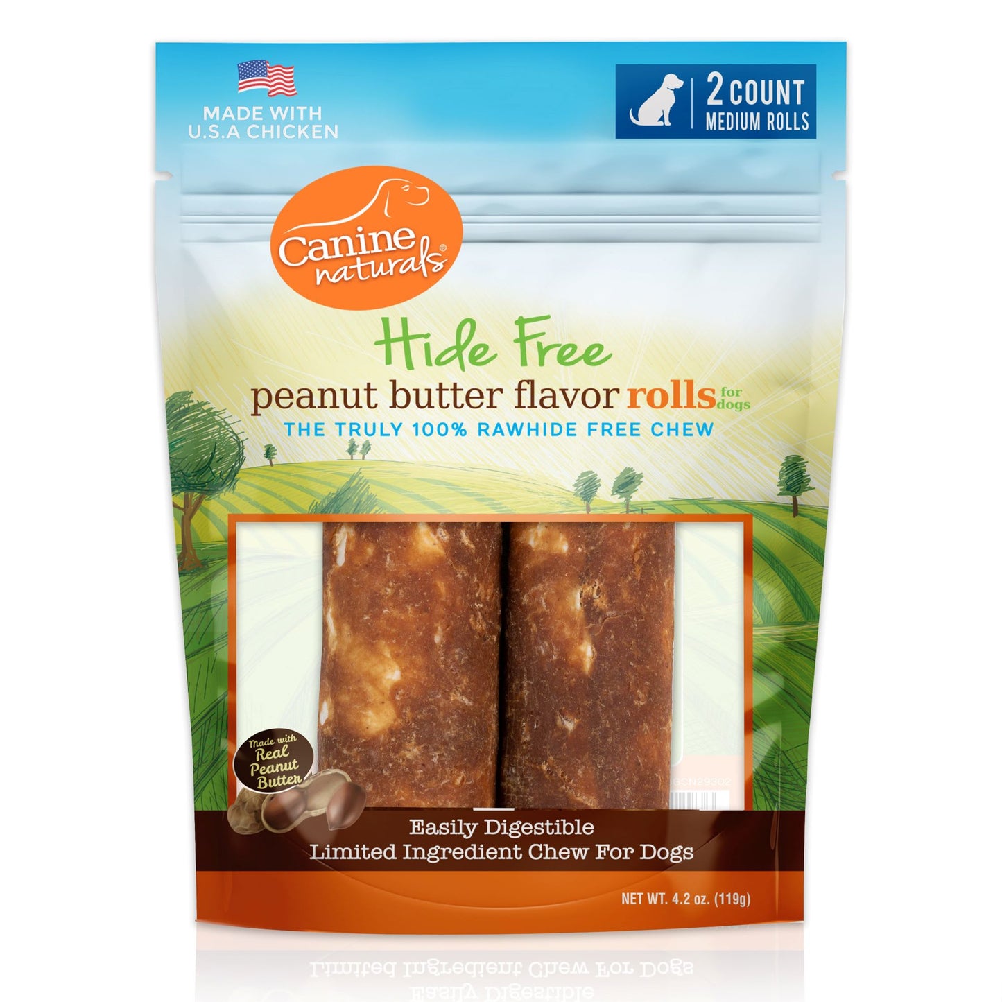 Canine Naturals Hide Free Peanut Butter Chews are the 100% rawhide free chews for dogs made with real peanut butter. These limited ingredient, easily digestible chews help fulfill a dog's natural chewing instinct while helping to maintain healthy teeth and gums. With no artificial flavors, colors preservatives or gluten these make these are sure to become your dog's favorite healthy chew.
